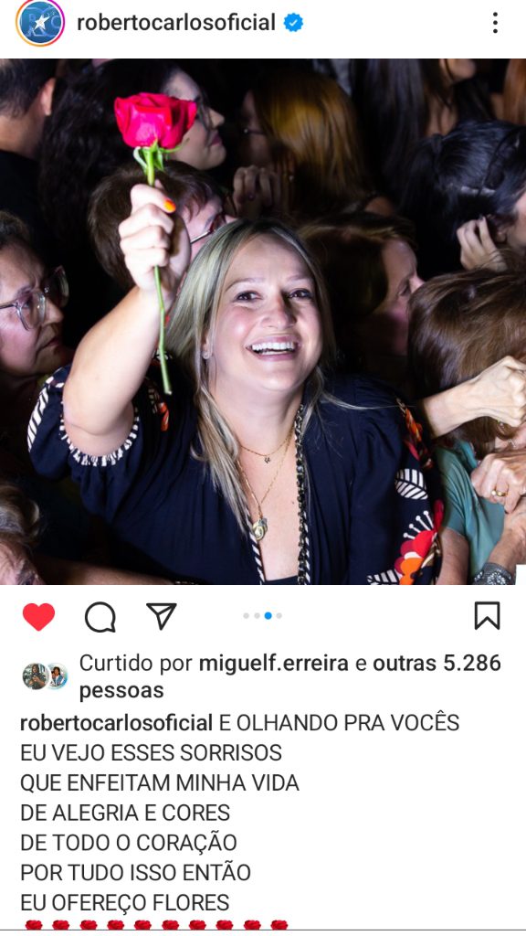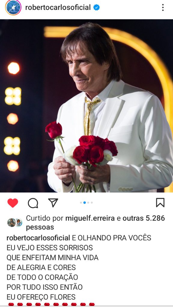 No próximo dia 22 vai ao ar na rede Globo “Eu ofereço flores”, programa Especial do cantor Roberto Carlos que gravado em 29 de novembro desse ano. O primeiro especial do cantor acorreu em 1974, há 49 anos.
