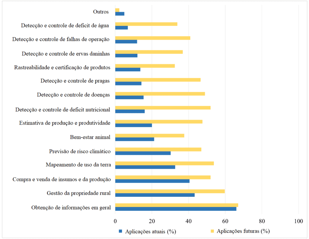 No entanto, as aplicações com maiores diferenças percentuais entre aplicações atuais e futuras estão relacionadas a tecnologias mais complexas que envolvem a detecção no controle de deficiências nutricionais (35%), doenças (33%), pragas (32%), falhas operacionais (29%), deficit hídrico (27%) e plantas daninhas (24%). Destacam-se também as aplicações nas estimativas de produção e produtividade (27%) e no mapeamento do uso do solo (21%).