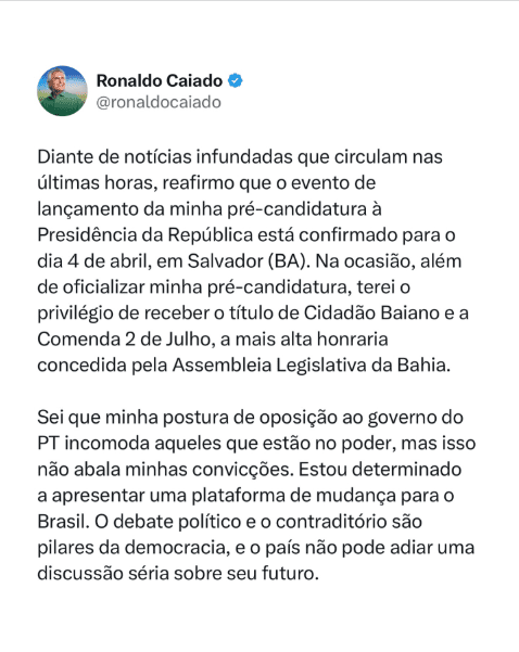 O governador de Goiás, Ronaldo Caiado (União), confirmou o lançamento de sua pré-candidatura à Presidência da República, marcado para 4 de abril em Salvador, mesmo com pressão de aliados – e do prórpio partido – para desistir. Isso acontece como estratégia de ampliar sua visibilidade – ainda pequena fora do Centro-Oeste – no Nordeste, reduto eleitoral de Lula, posicionando-se como opositor ao governo do PT.