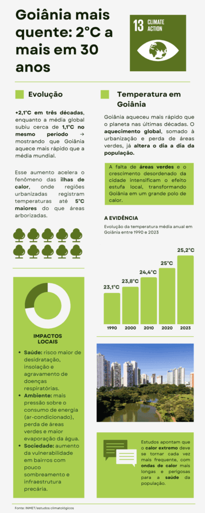 A este cenário ambiental se soma o fator climático nos estados do Centro-Oeste. Em Goiás, por exemplo, uma análise baseada em dados do INMET apontou que, nos últimos 30 anos, a temperatura média estadual subiu cerca de 1,5 °C.